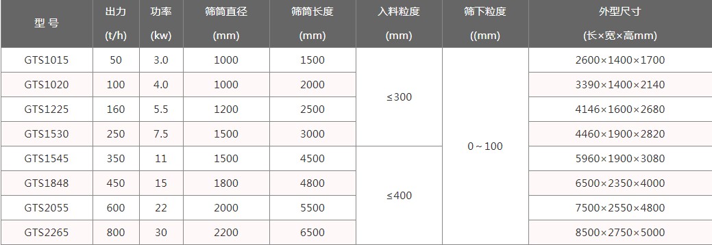 滾筒裝置在驅動裝置的驅動下轉動,當物料進入滾筒裝置后,由于滾筒裝置的傾斜與轉動,使篩面上的物料翻轉與滾動,使合格物料(篩下產品)經滾筒后端底部的出料口排出,不合格的物料(篩上產品)經滾筒尾部的排料口排出。