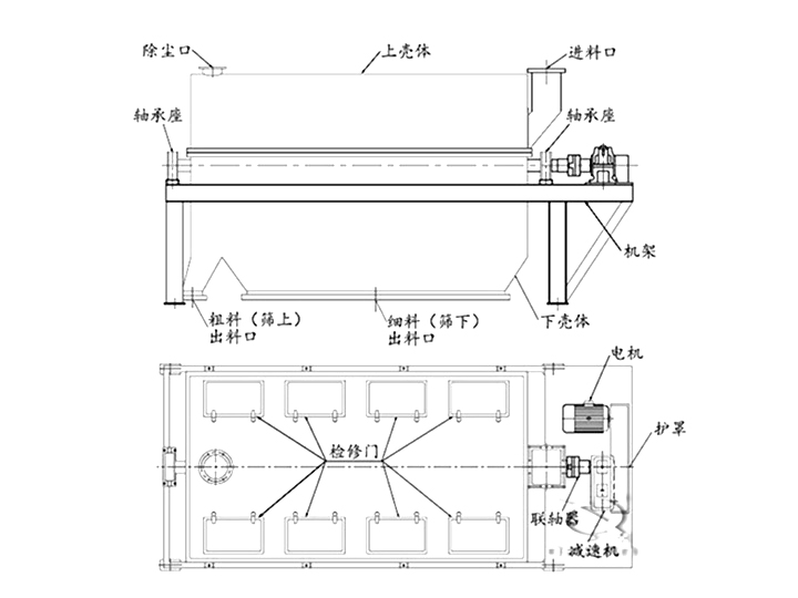 無軸滾筒篩通常由篩筒、滾筒、減速電機、支撐架等組成,這些部件共同協作,使無軸滾筒篩能夠快速地進行物料的篩分和分級工作。一下是無軸滾筒篩的主要結構